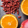 Apple, Pomegranate, Pineapple, Orange, Goji Berry, Elderberry, Coconut, Mango, Papaya, Sea Buckthorn Berries, Chokeberry, Tartaric and Citric Acids, Black Currants, Organic Hibiscus